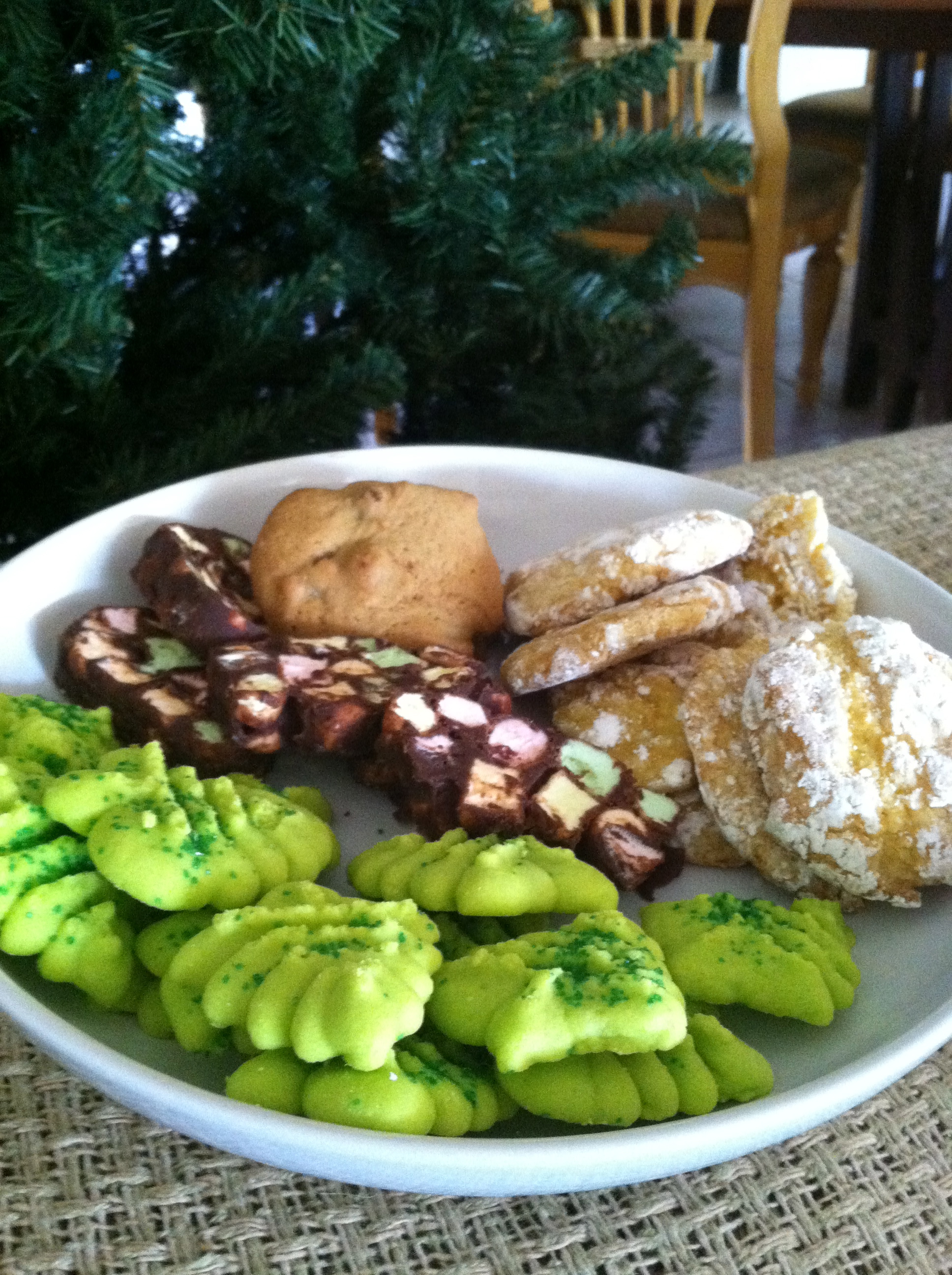You can share cookies. The picture in this post is of the first cookie plate I received this season (Thank you, Lisa!) You can make 8 dozen of one type of cookie, get together with 7 friends who make 8 dozen of a different cookie each, then swap the cookies for a total of 8 dozen different cookies each. You can give cookies as gifts as well as have them available to serve guests. Consider having a Holiday Open House and simply serve cookies and festive beverages.